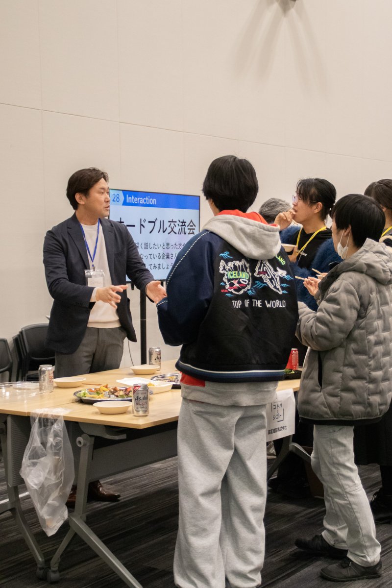 懇親会では、企業の方と学生の距離が本編よりもさらに縮まったような印象がありました。かしこまった自己紹介も、